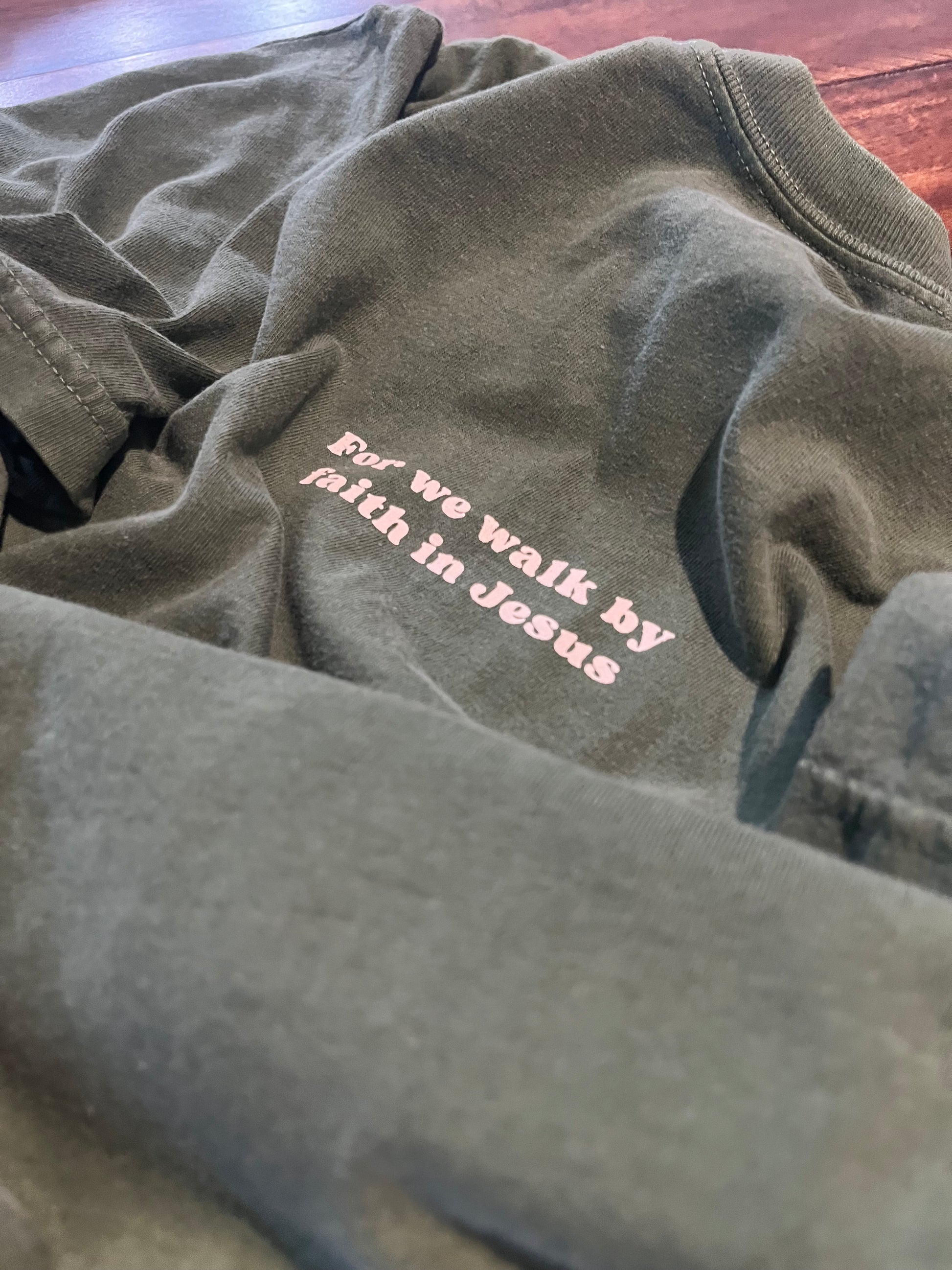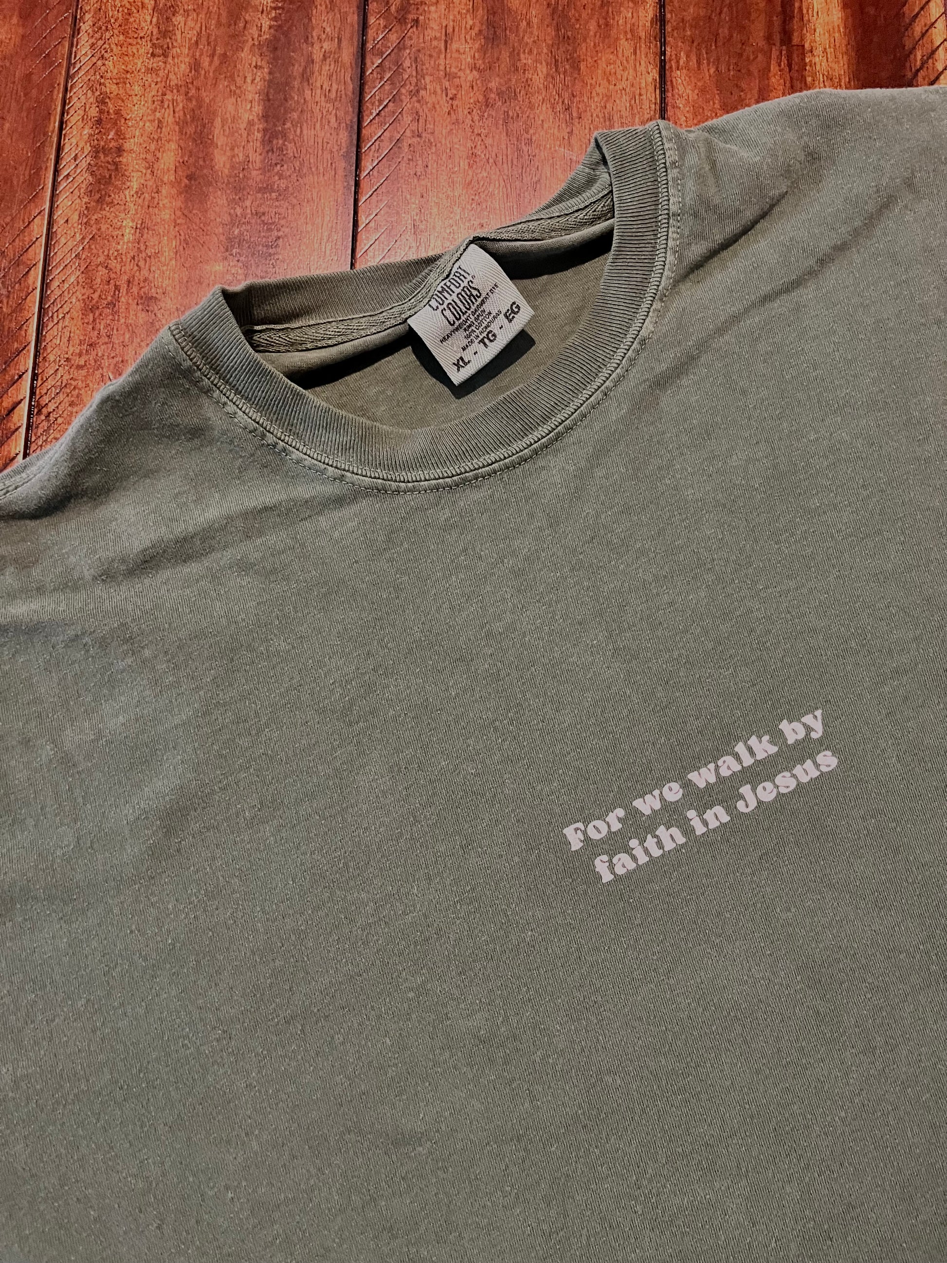 The Increase Jesus "For We Walk By Faith in Jesus" T-shirt features a print on a moss green Comfort Colors short-sleeve shirt. The front of the shirt displays the words "For We Walk By Faith in Jesus" in tan.