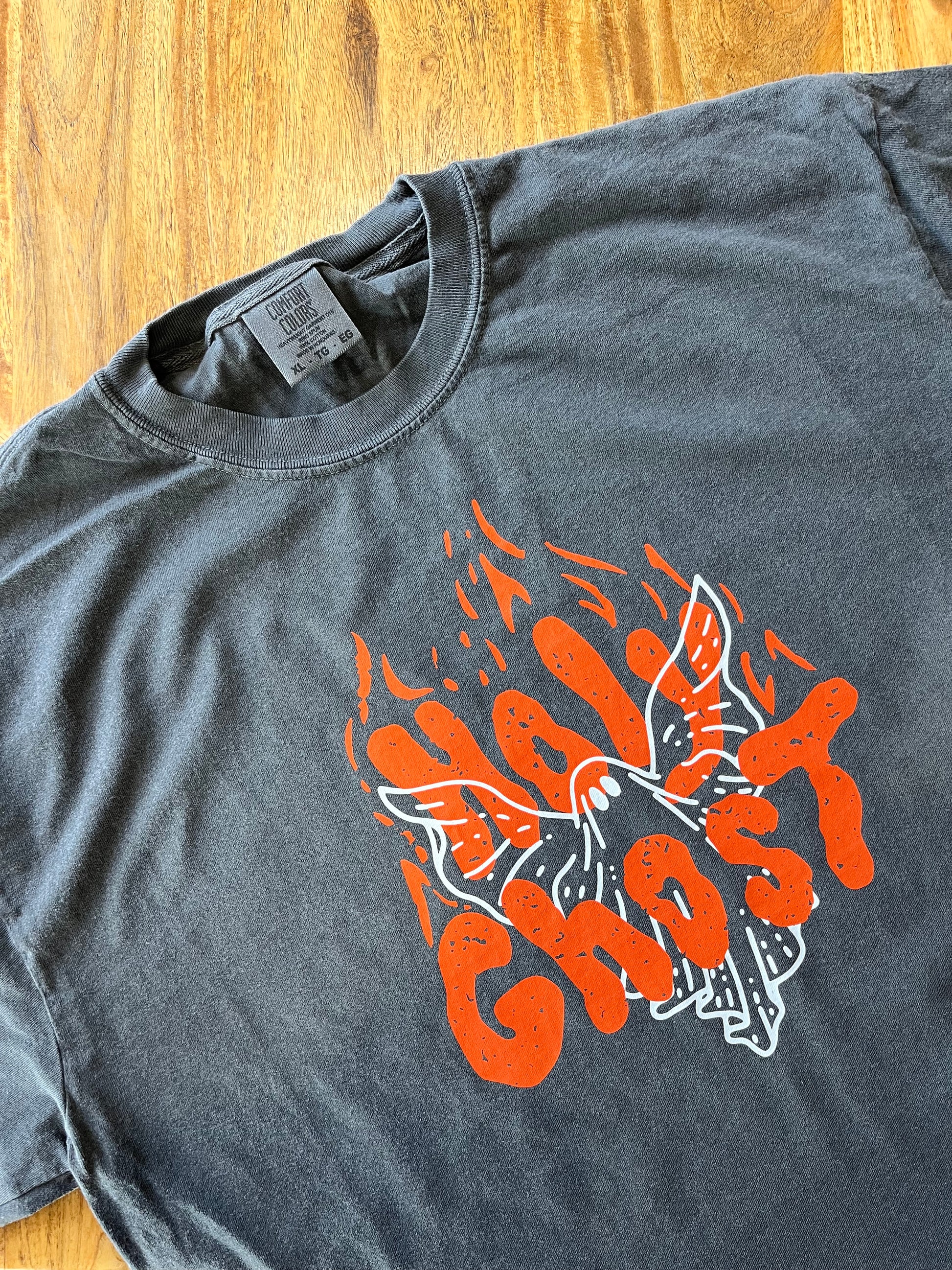 The Increase Jesus "Holy Ghost" T-shirt features a print on a pepper grey Comfort Colors short-sleeve shirt. The front of the shirt displays the words "Holy Ghost" in orange accompanied by the graphic of a white dove dressed as a ghost. This design depicts two of the representations of the Holy Spirit, fire and a dove.