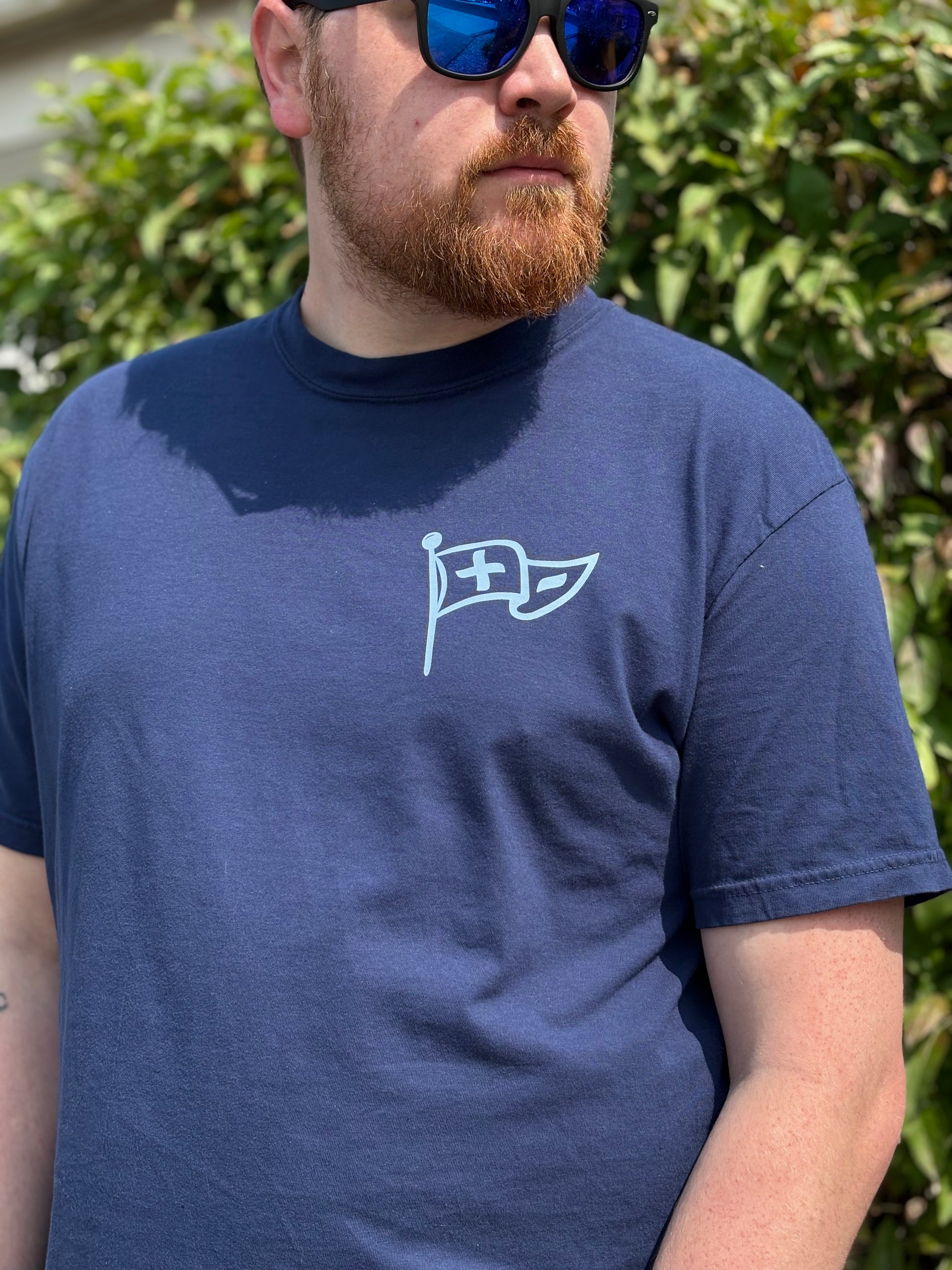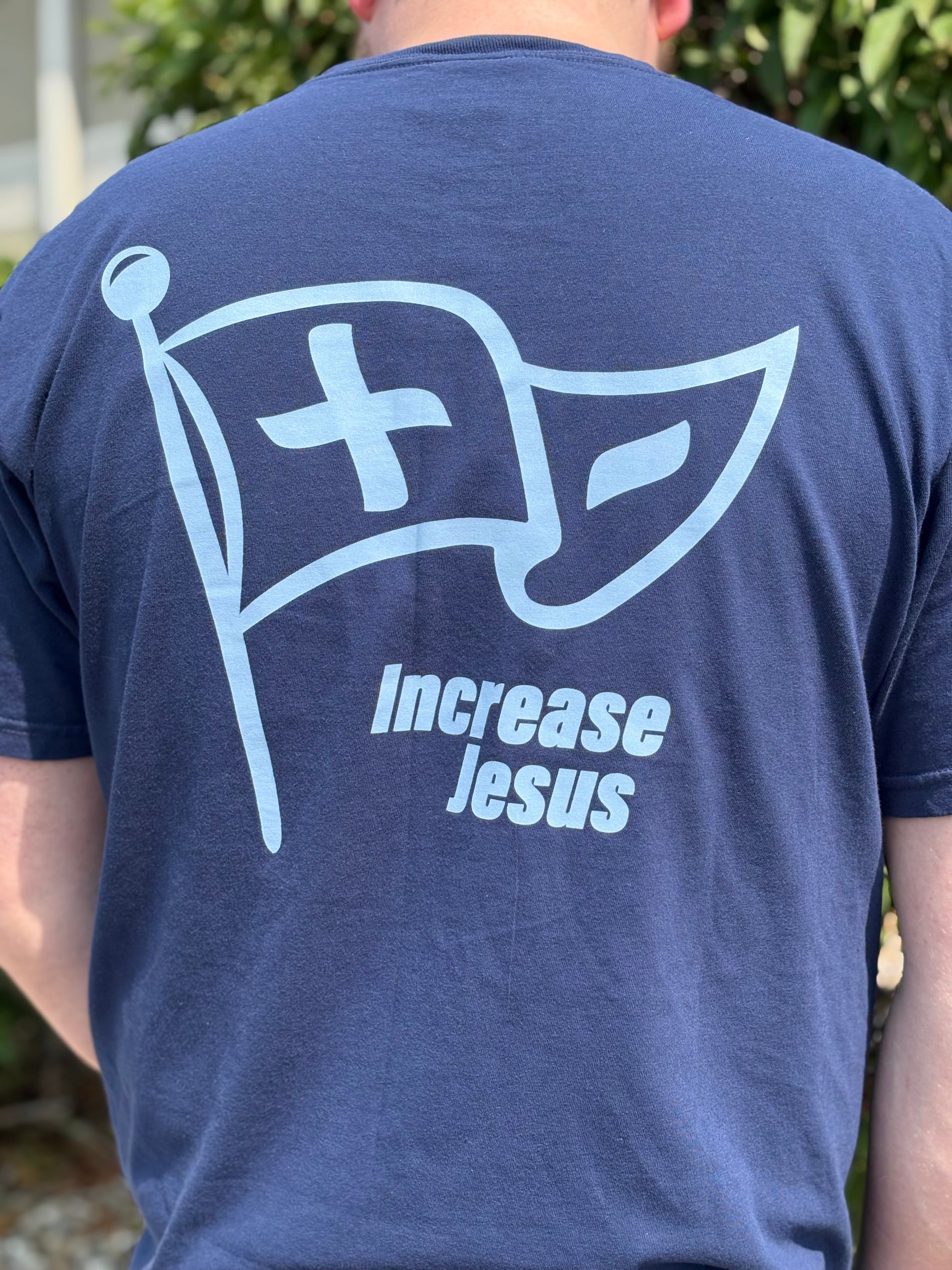 The Increase Jesus Camp Flag T-shirt features a print on a Navy Comfort Colors short-sleeve shirt. The front of the shirt displays a flag with the Increase Jesus Emblem. The back showcases a flag with the Increase Jesus Emblem with the words “Increase Jesus” under the flag.