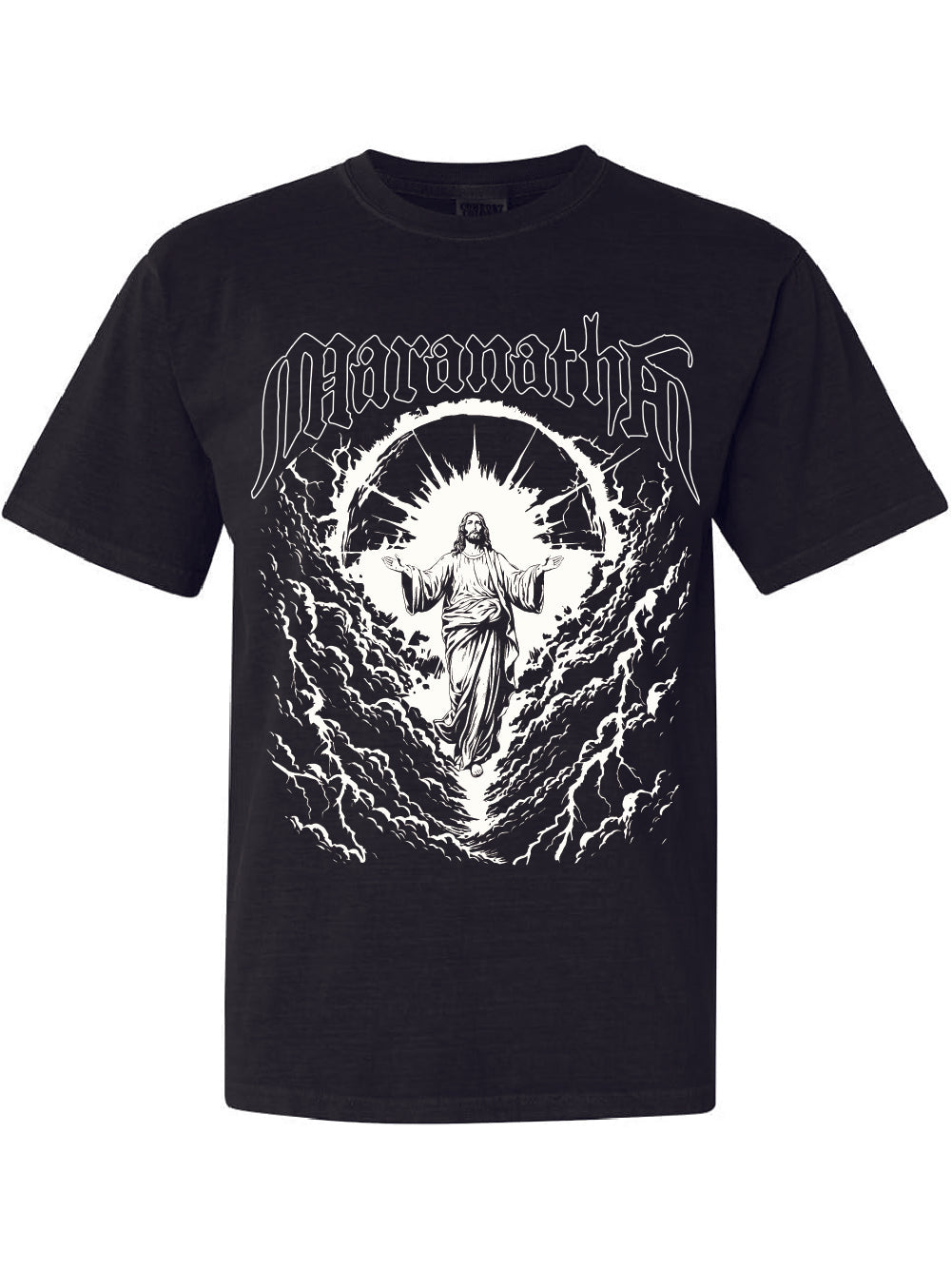 The Increase Jesus Maranatha T-shirt features a print on a black Comfort Colors short-sleeve shirt. The front of the shirt displays the phrase ‘Maranatha’ with a depiction of the second coming of Jesus in White.