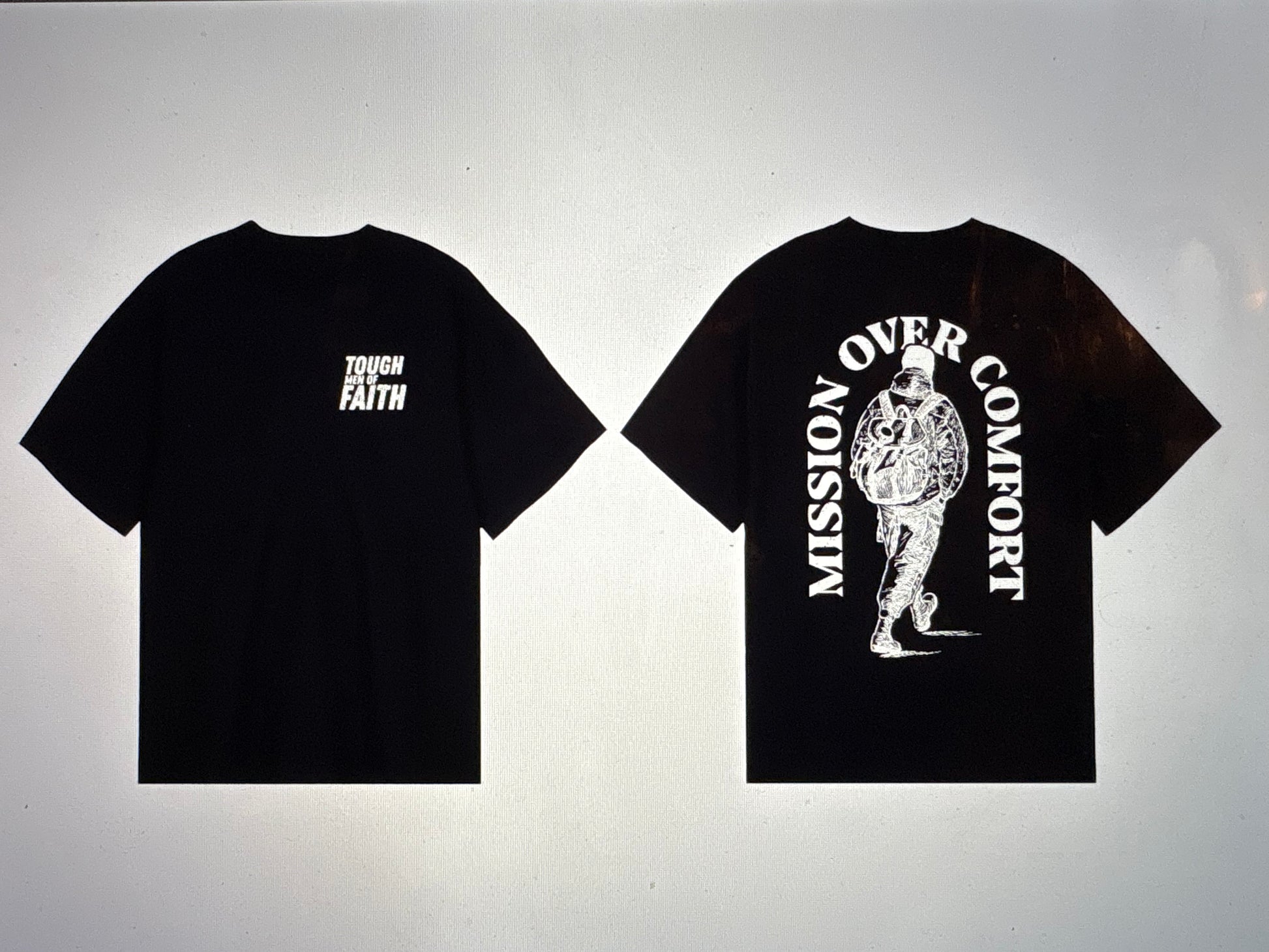 The Tough Men of Faith Mission Over Comfort T-shirt features a print on a black Comfort Colors short-sleeve shirt. The front of the shirt displays the TMOF Logo. Additionally, the back includes a white graphic depicting a man hiking, accompanied by the words "Mission Over Comfort".