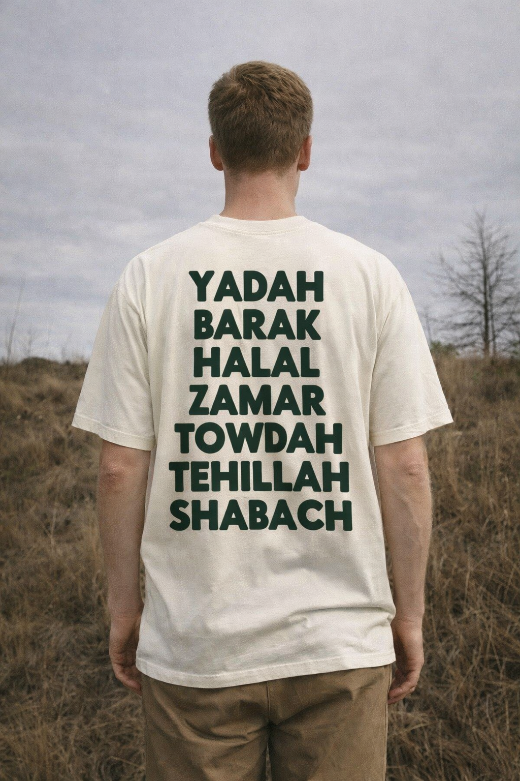 The Increase Jesus PRAISE T-shirt is a collaboration with YADAHHAUS and features a print on an Ivory Comfort Colors short-sleeve shirt. The front of the shirt displays the word “Praise” in dark green. The back of the shirt lists seven Hebrew words for praise in dark green: Yadah, Barak, Halal, Zamar, Towdah, Tehillah, Shabach.