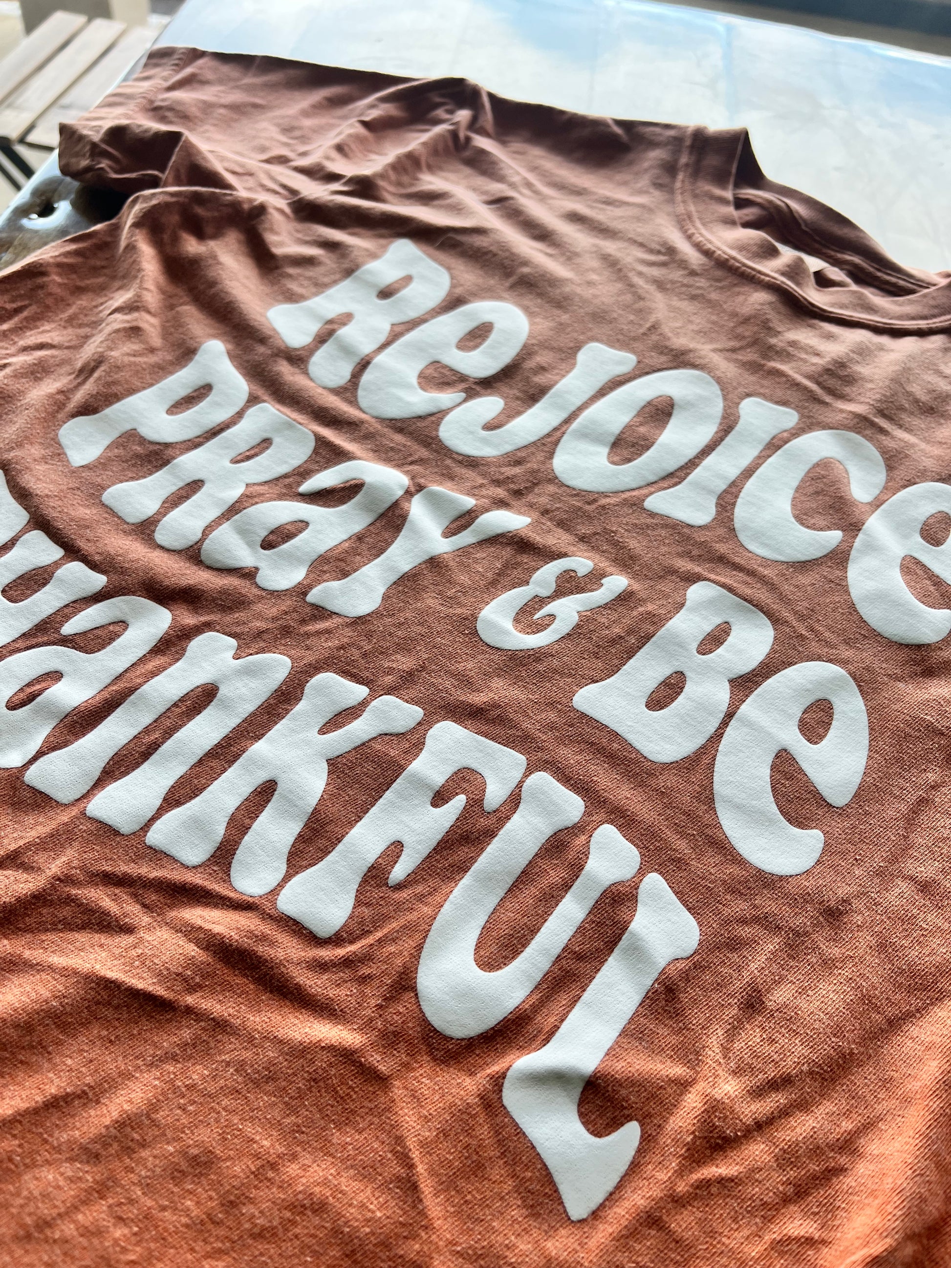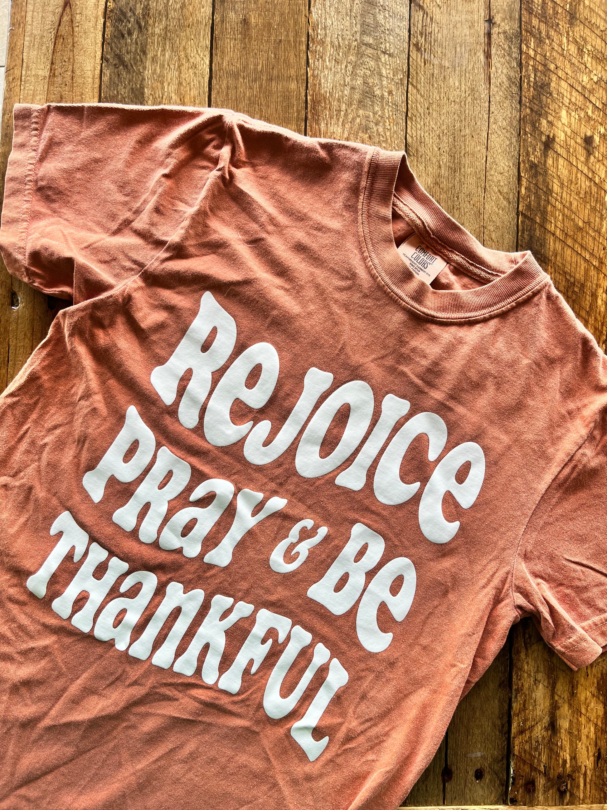 The Increase Jesus Rejoice Pray and Be Thankful T-shirt features a print on a Yam Comfort Colors short-sleeve shirt. The front of the shirt displays the words "Rejoice Pray and Be Thankful" in white puff ink. This design is a reminder to "Rejoice always, pray continually, give thanks in all circumstances, for this is God's will for you in Christ Jesus."