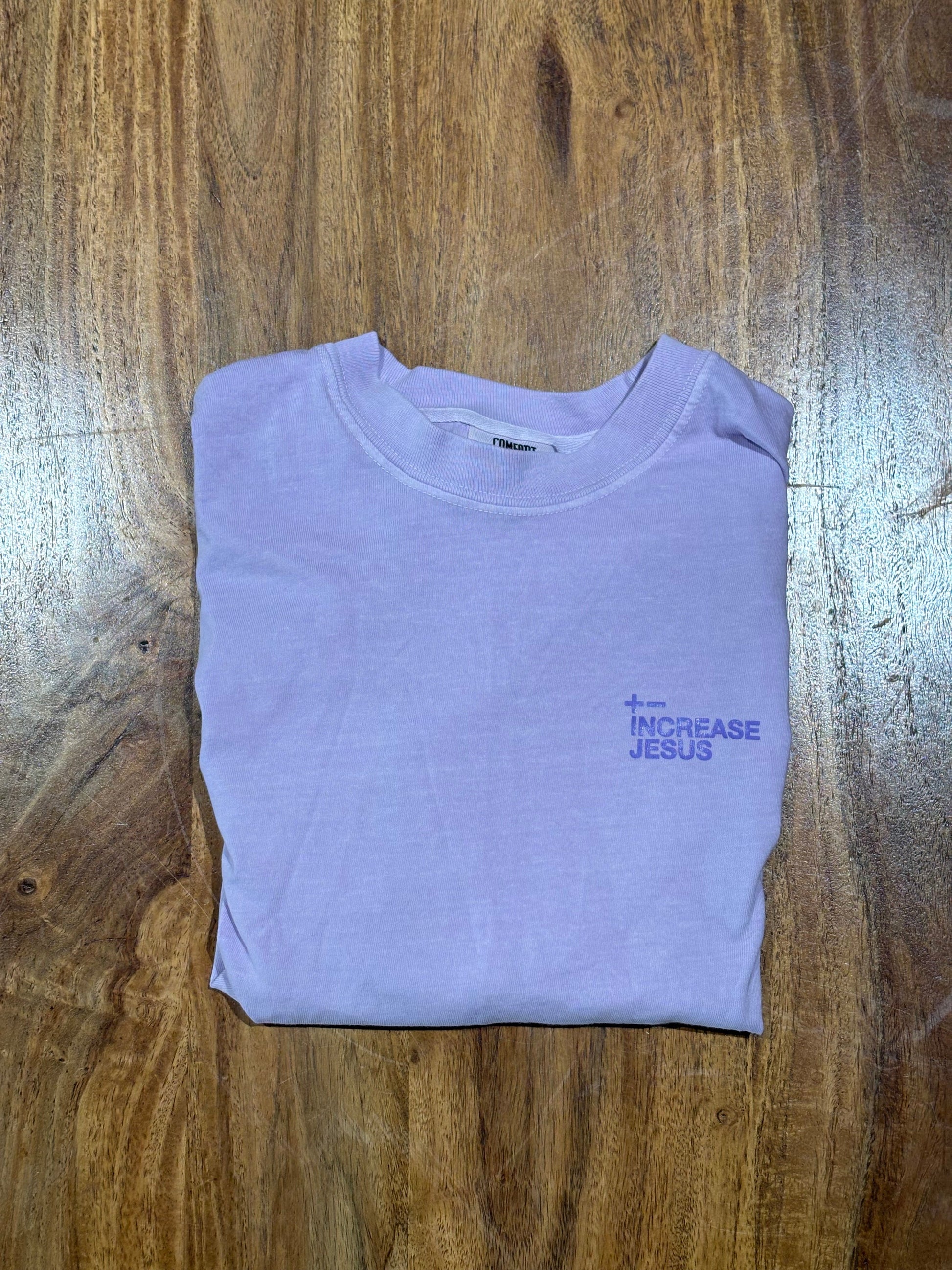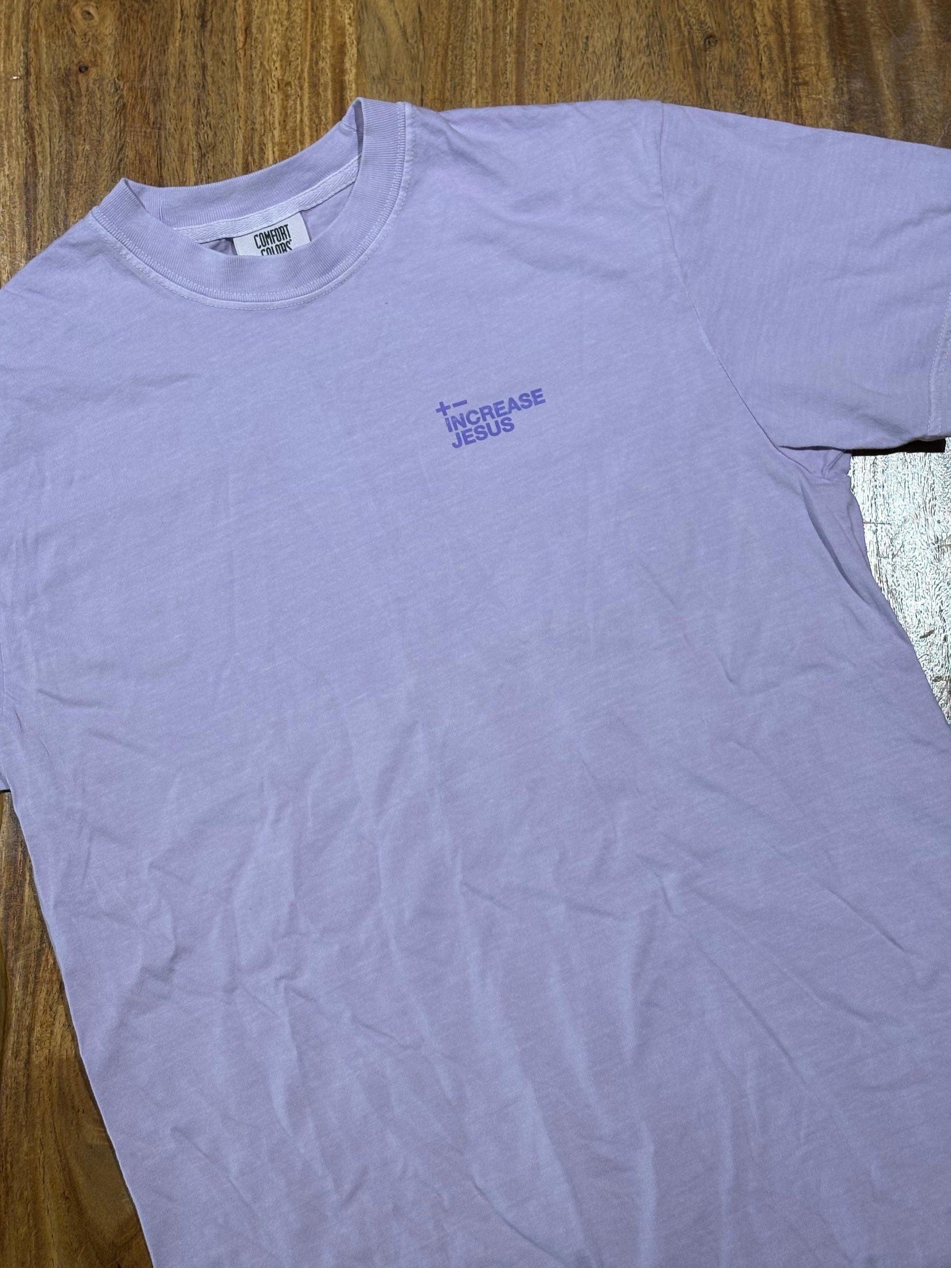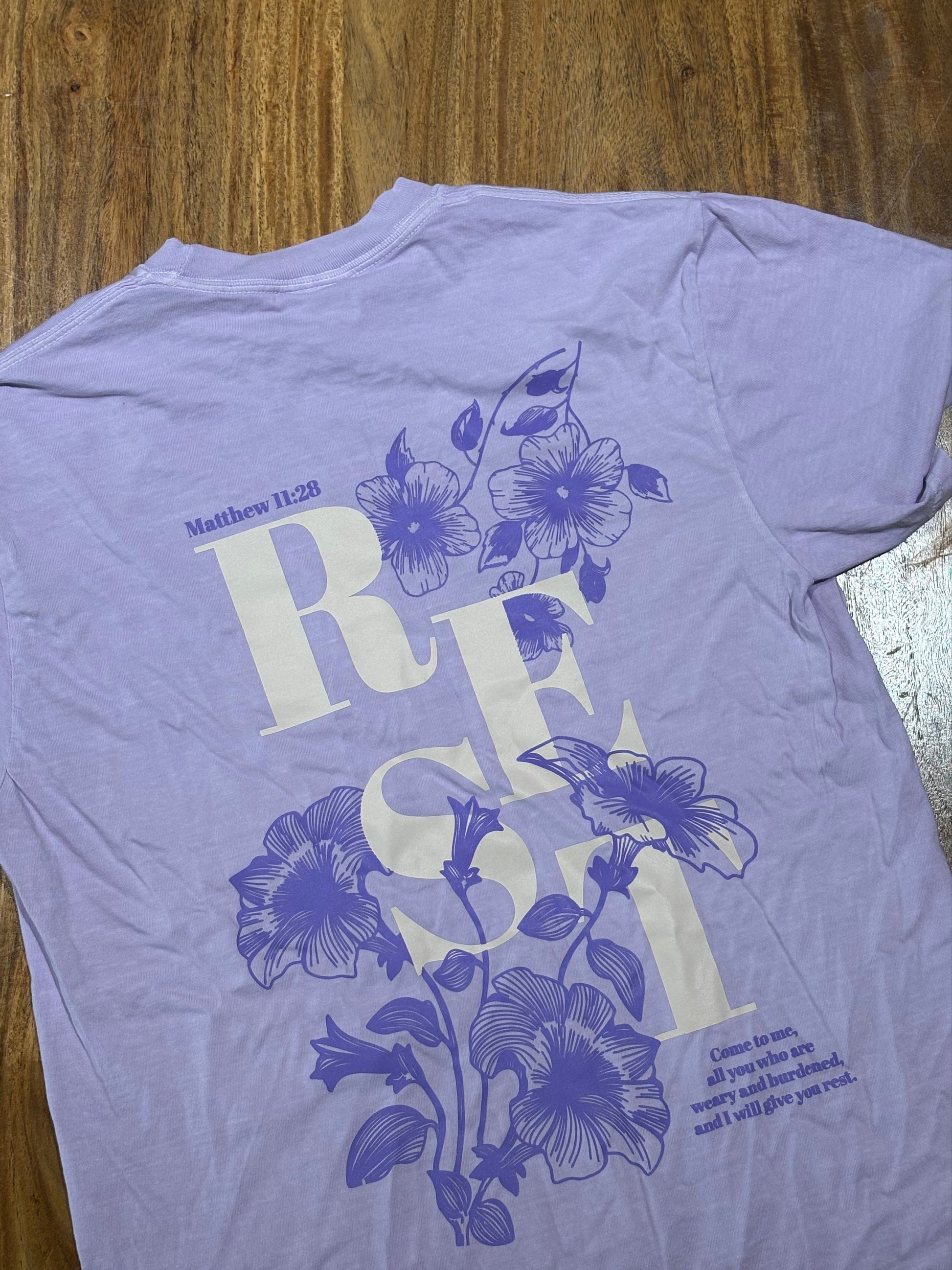 The Increase Jesus “Rest” T-shirt is printed on a soft lilac Comfort Colors short-sleeve shirt. The front design is subtle, featuring a small purple Increase Jesus logo on the right chest. On the back, the word “REST” appears in tan, beautifully intertwined with purple flowers, while the full verse from Matthew 11:28 is placed in the bottom right corner as a reminder of Jesus’ invitation.